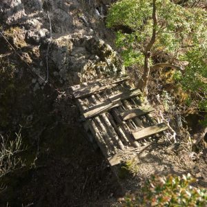 出だしは車力道を歩き、絶壁階段の手前から石切場の壁際の踏み跡を伝い登る、アドベンチャーコースへ。